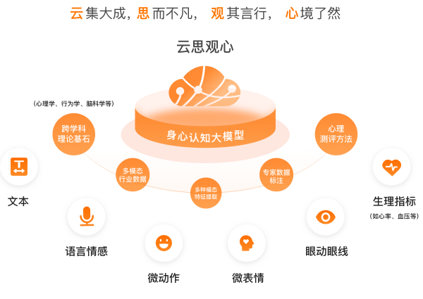 云思观心多模态身心认知大模型是云思创智历时5年自主构建研发,已获国家网信办算法备案 (网信算备320105247879901240019号) ,模型利用先进的多模态大模型融合技术,通过远程非接触无感知的方式采集并分析人的身心状态外化特征,包括微表情、肌肉震颤、生理指标(心率、血压)、语音语调、眼动眼线等。结合基于Transformer和动态置信度的多模态融合框架进行跨模态语义映射,精准感知环境变化与人的身心活动,增强机器对人身心状态的理解能力,让每一个机器人都成为有独特个性的智能体终端,最终实现生命级人机互动新范式,引领具身智能2.0时代。