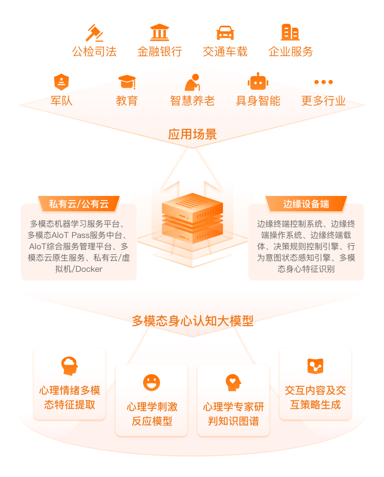 依托大模型的强大能力,我们构建了多模态身心认知大模型全场景智能体平台底座,为政法、教育、企业服务、具身智能等多个行业提供高效、智能的解决方案,全面赋能千行百业加速迈向智能化未来。
